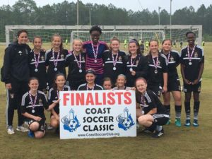 The Southern States Soccer Girls attended the Coast Soccer Classic last weekend. The girls lost their first game to Stone Blue Strikers but rallied in the second game to defeat the Neon Lights 6-0 with Victoria Luther scoring a haul. The third game the girls battled tirelessly and tied with CSC Galaxy. This created a tie between Southern States Soccer and CSC Galaxy as to who would advance to the finals. Luck was on the ladies’ side and Coach Jade won the coin toss thereby advancing the Southern State Soccer Girls to the finals. On Sunday due to the weather conditions the championship game against the Blue Stone Strikers was shortened. After battling fiercely on the pitch the score ended tied 0-0 with Penalty Kicks deciding the outcome. Unfortunately, the girls lost 3-5 by PK’s bringing home the silver medal. The girls did a phenomenal job of playing as a team and working together.